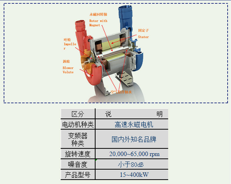 空气悬浮的核心组件有:不锈钢蜗壳、空气悬浮轴承、高速离心叶轮,这几个组件组成了风机的核心部分,是鼓风机工作的重点部分。空气悬浮鼓风机产品页